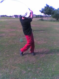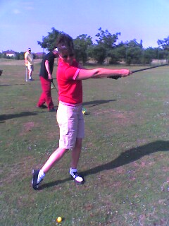 This was a very big improvement, because at the beginning of the week, you didn't know anything about golf. If you want to be able to swing the club the way you do it on the first picture, beware the position of your club in the middle of the backswing. As you can see, the shaft is too much "behind" you. At the moment you hit the ball, it is quiet good. You could just work a little more with your legs, to give speed to the club. |