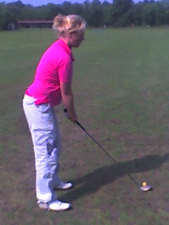 We worked on the backswing. As you can see on the first picture, the problem is that the hands are too much "behind". On the second picture, the backswing is shorter but the hands are "deside" you, and so it will be easier to follow the right line towards the target. Anyway, as we said, there is a very small difference between the two pictures. |